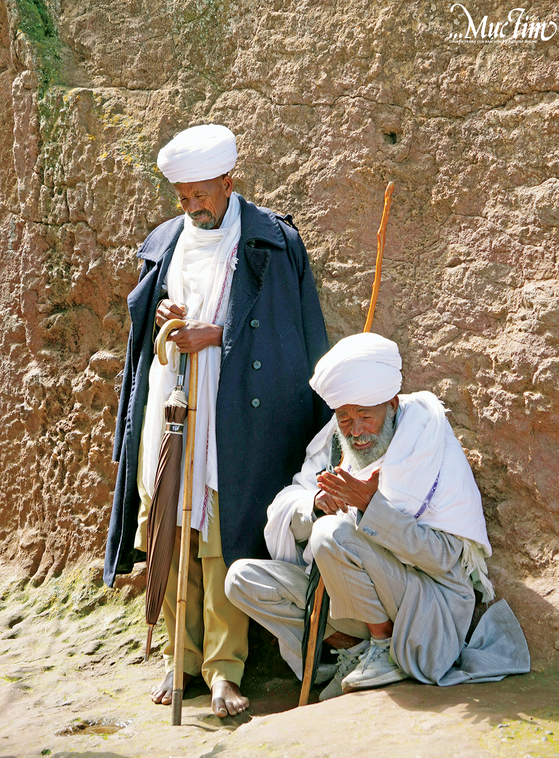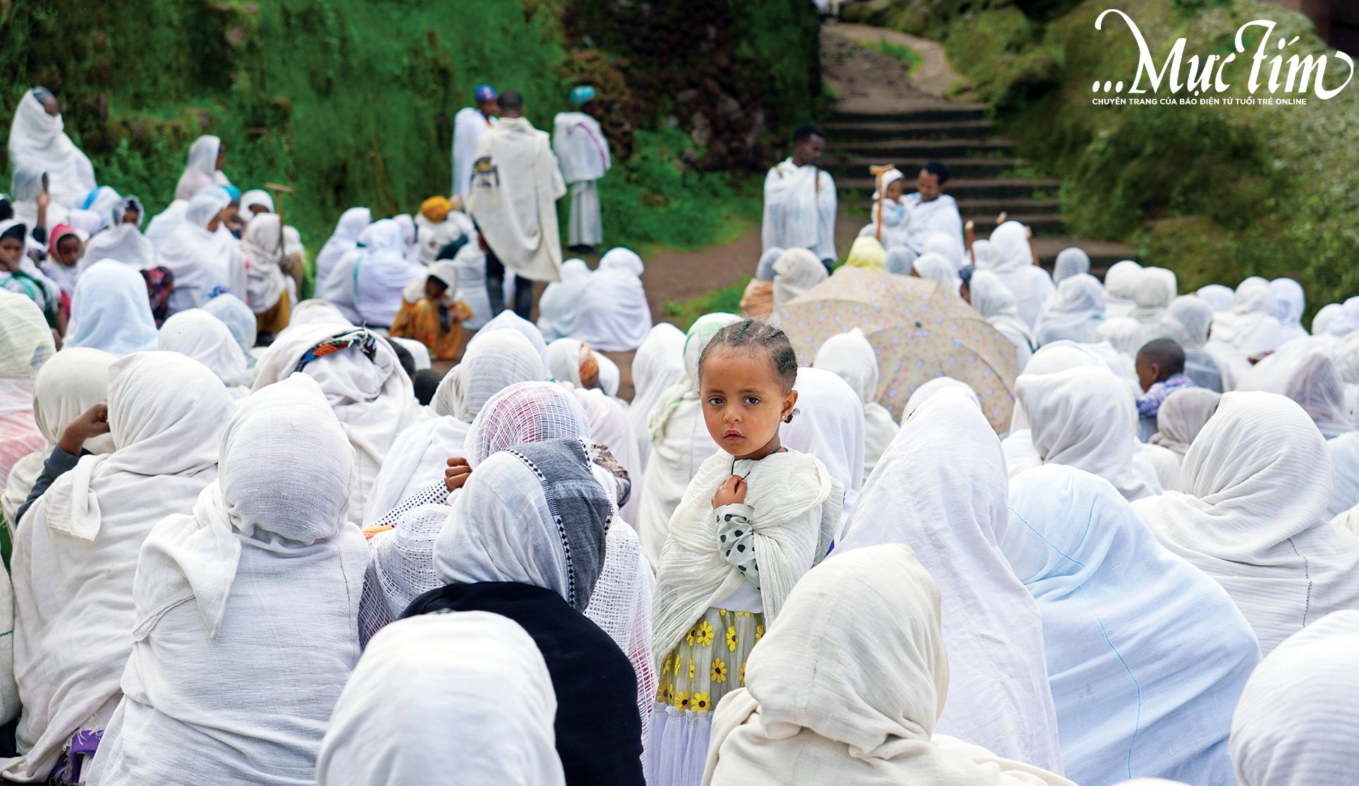 Gần sân nhà thờ, tiếng cầu nguyện ngân lên đều đặn. Người dân mộ đạo khoác bộ Habesha Kemis trắng tinh, phụ nữ quàng khăn netela, đàn ông choàng khăn trắng qua vai. Họ đứng thành từng vòng cung, mắt hướng về cửa điện.