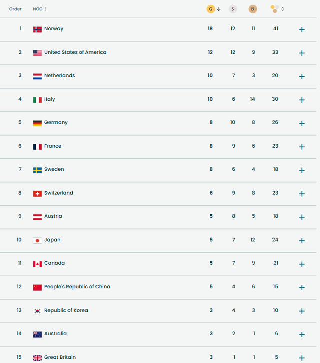 Tại Thế vận hội mùa đông 2026, Na Uy dẫn đầu bảng tổng sắp huy chương với 18 huy chương vàng, 12 huy chương bạc và 11 huy chương đồng, tổng cộng 41 huy chương.
