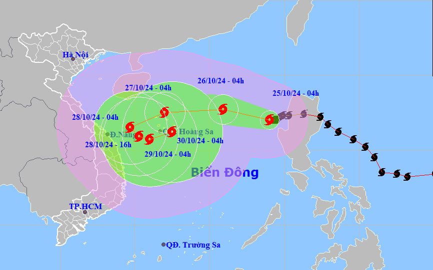 Theo bản tin phát lúc 14h của Trung tâm Dự báo khí tượng thủy văn quốc gia, hồi 13h ngày 25-10, cơn bão số 6 có vị trí tâm ở khoảng 17,6 độ Vĩ Bắc; 117,3 độ Kinh Đông, trên vùng biển phía Đông của khu vực Bắc Biển Đông, cách quần đảo Hoàng Sa khoảng 560km về phía Đông Đông Bắc.