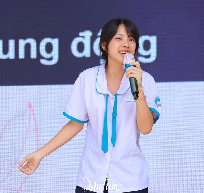 Đây là lần thứ hai bạn Nguyễn Đỗ Xuân Nghi (lớp 10A13) tham gia trình diễn. Các bạn trong lớp Nghi còn mang cả băng rôn của lớp để ủng hộ cho bạn.