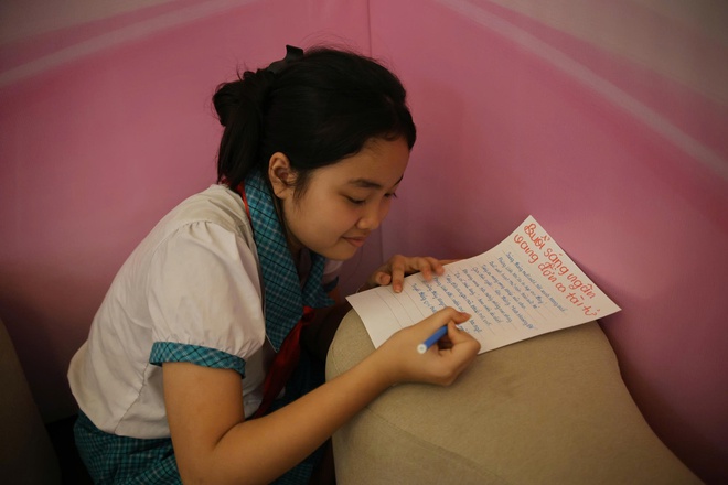 Bạn Nguyễn Phạm Hoài Đan (lớp 7/4, THCS Tăng Nhơn Phú B, phường Tăng Nhơn Phú, TP.HCM) hí hoáy ghi chép những chi tiết trên gương mặt của các nghệ sĩ cải lương.
