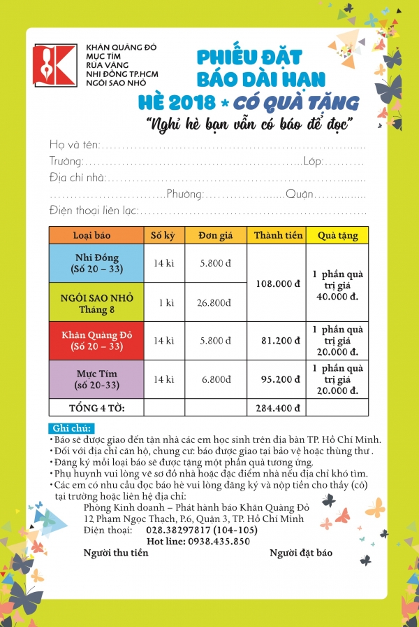 Phiếu đặt báo các ấn phẩm của tòa soạn báo Khăn Quàng Đỏ