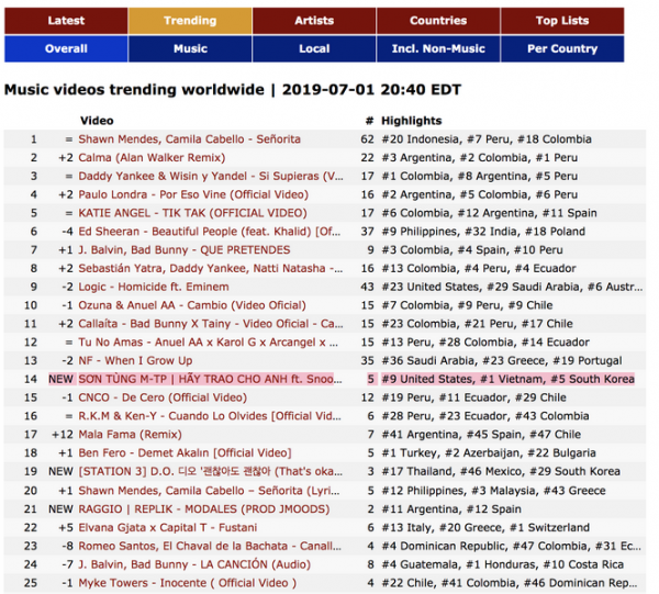 Ở thành tích quốc tế, MV cũng đã vươn đến top 2 trending tại Canada, top 9 trending tại Mỹ, top 5 trending tại Hàn Quốc. Thành tích này còn ghi nhận Hãy trao cho anh xếp thứ 14 trên top trending YouTube toàn cầu. Đặc biệt, Sơn Tùng M-TP đã xuất sắc sở hữu MV được xem nhiều nhất thế giới trong 24 giờ của ngày 1/7. Tính riêng ở khu vực châu lục, Sơn Tùng M-TP cũng nghiễm nhiên sở hữu MV được xem nhiều nhất Châu Á trong 24h của ngày 1/7.