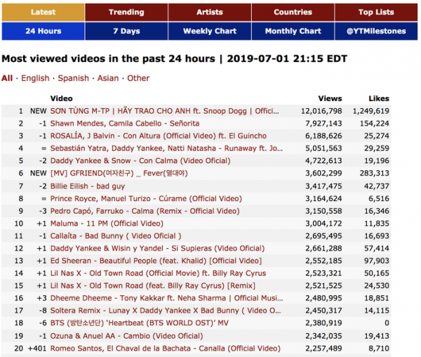 Như vậy, tính đến thời điểm hiện tại, Sơn Tùng M-TP và Hãy trao cho anh đã tự thiết lập nên những kỉ lục lịch sử của làng nhạc Việt: đạt 1 triệu views chỉ trong 8 phút, 2 triệu views trong 14 phút, 6 triệu views trong 75 phút, 10 triệu views trong 3 tiếng 17 phút (tính theo thời gian thực tế). Bên cạnh đó, đây cũng là MV đạt 1 triệu like nhanh nhất lịch sử Vpop (2 tiếng 59 phút), đồng thời là MV được xem lúc công chiếu đứng thứ 3 thế giới với trên 625.000 lượt xem, chỉ xếp sau Kill This Love - BlackPink và Thank u, next - Ariana Grande.