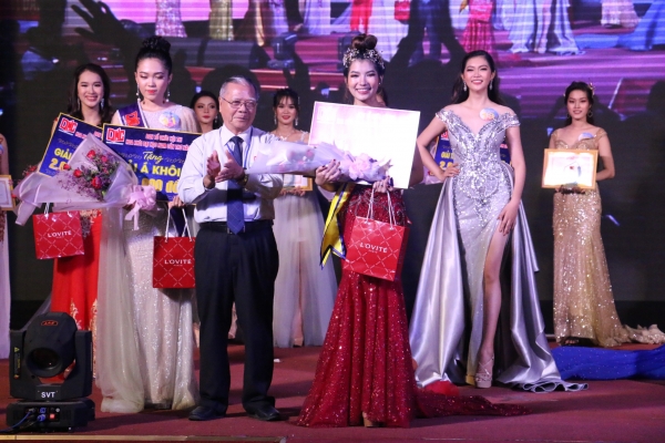 TS-LS Nguyễn Tiến Dũng – Chủ tịch HĐQT Trường ĐH Nam Cần Thơ trao vương miện, giấy chứng nhận, băng đeo, hoa và giải thưởng cho tân hoa khôi “DNC” 2019