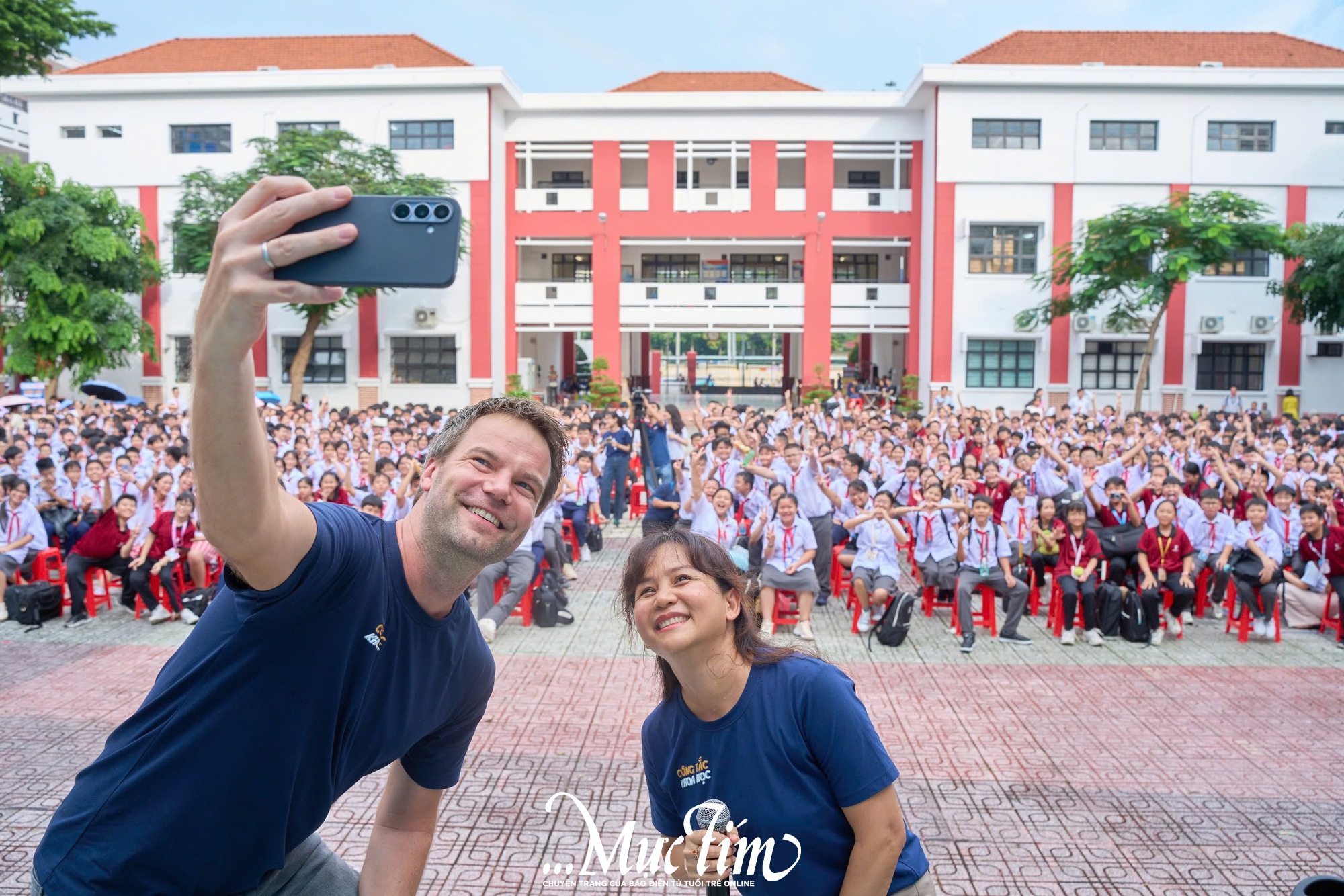 Ông Maximilian Rummert (Tổng giám đốc Công ty TNHH Bayer Việt Nam) và bà Phạm Thị Hà Giang (Giám đốc truyền thông Bayer Việt Nam) chụp ảnh lưu niệm cùng học sinh Trường THCS Hoàng Hoa Thám - Ảnh: VŨ