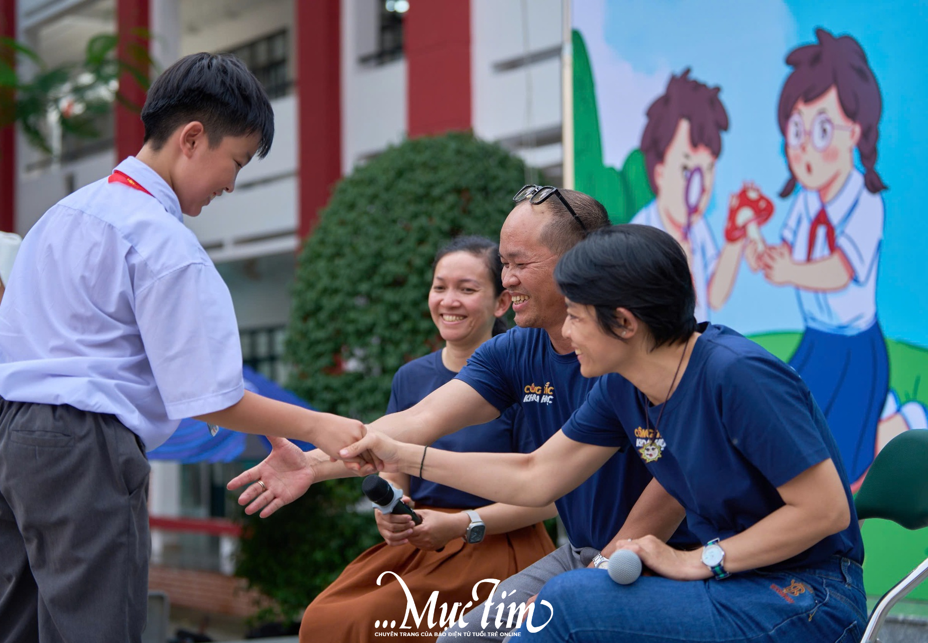 Bạn học sinh bắt tay với ba nhà khoa học - Ảnh: VŨ