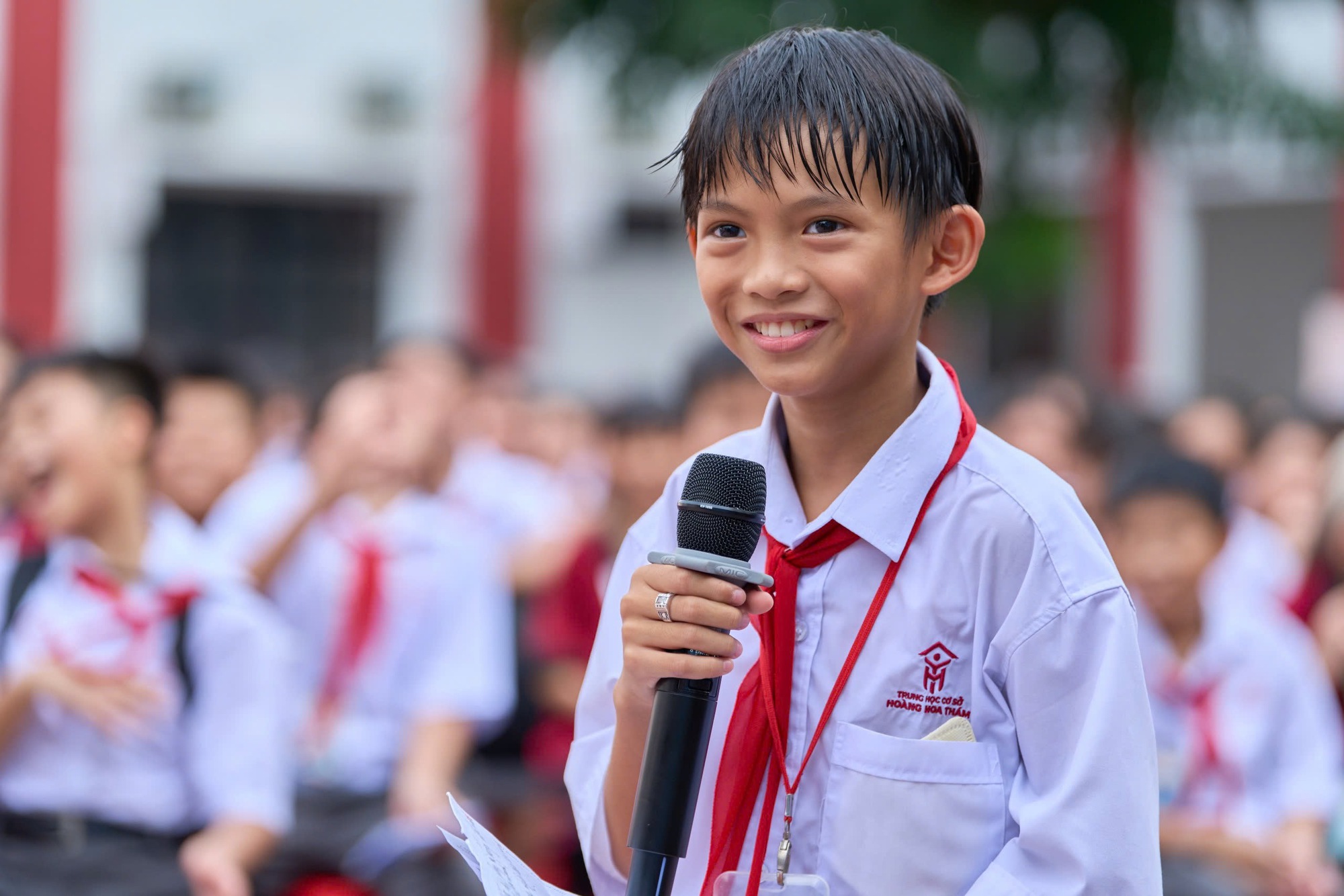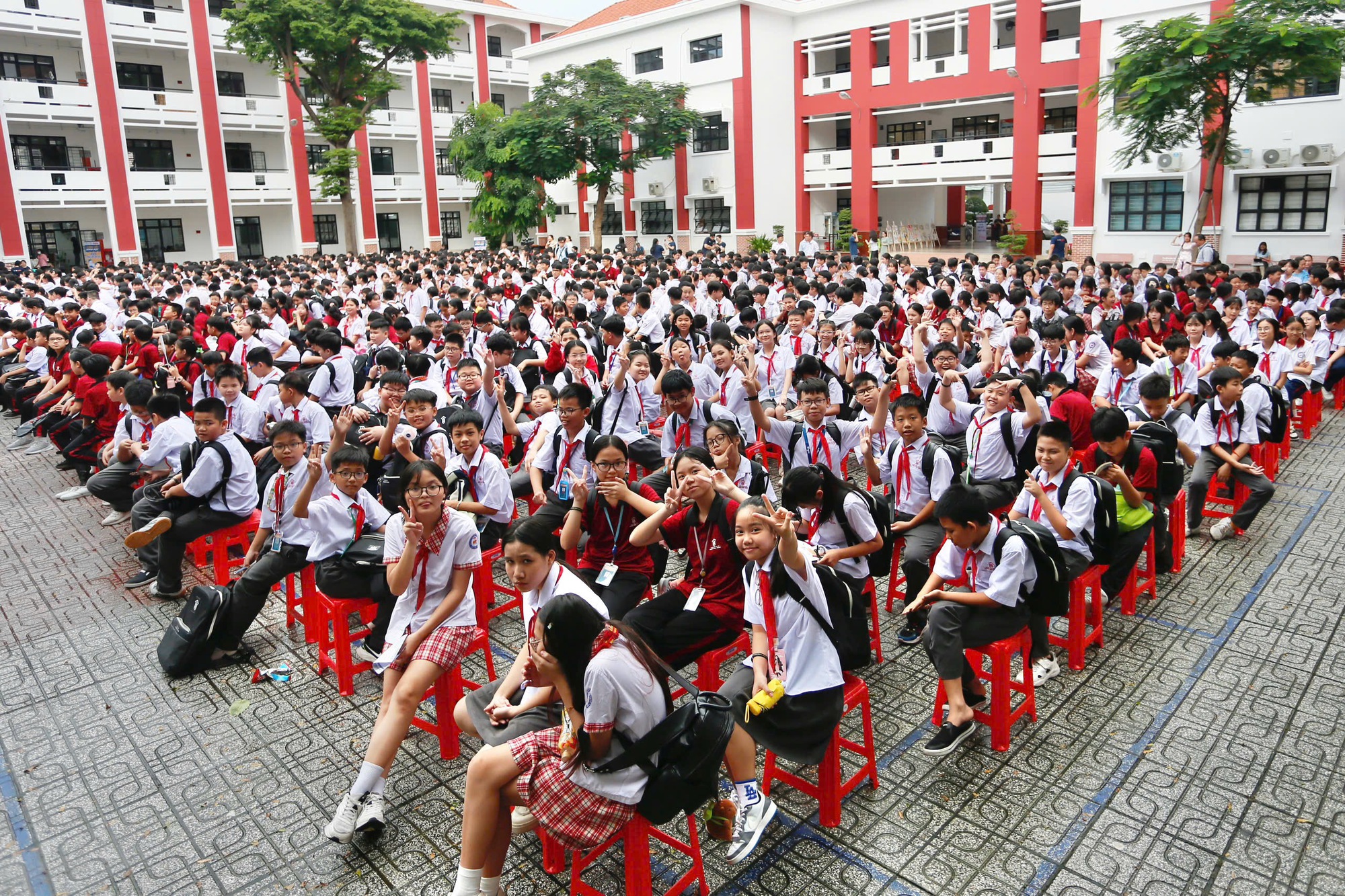 Học sinh Trường THCS Hoàng Hoa Thám trước giờ diễn ra chương trình - Ảnh: TRỌNG ANH