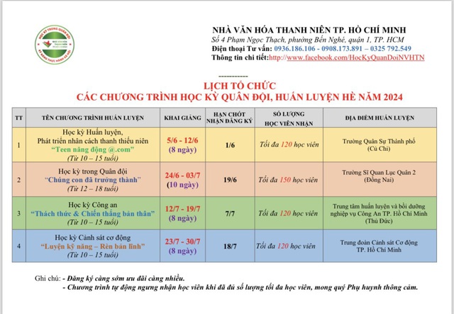 Thời gian tổ chức các chương trình của Học kỳ Quân đội, huấn luyện hè năm 2024 của Nhà văn hóa Thanh niên TP.HCM - ẢNH: BTC