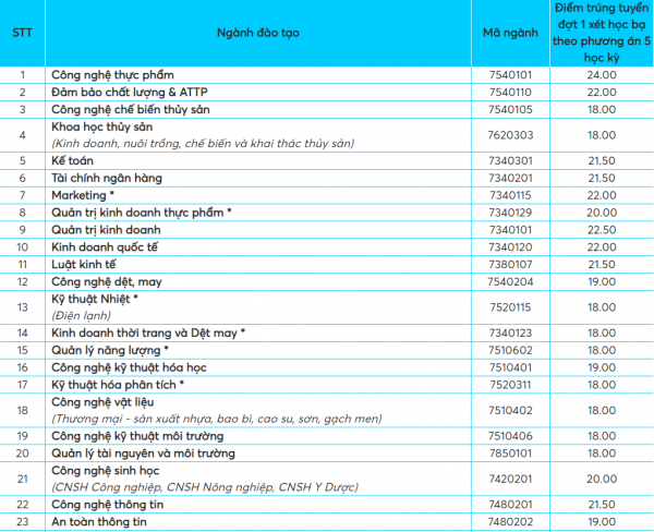 Theo đó, Công nghệ thực phẩm là ngành có điểm chuẩn cao nhất với 24 điểm. Kế đến là Quản trị Kinh doanh với 22,5 điểm. Các ngành còn lại có mức điểm dao động từ 18 đến 22 điểm. Mức điểm này được tính theo tổ hợp xét tuyển của lớp 10, 11 và học kỳ 1 của lớp 12.