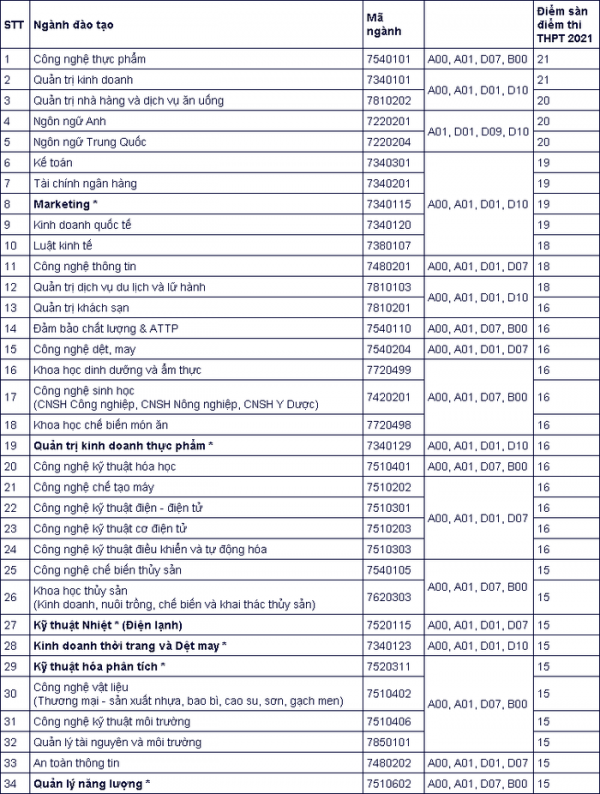Theo đó, các ngưỡng điểm đảm bảo đầu vào của ĐH Công nghiệp Thực phẩm TPHCM dao động từ 15 cho đến 21 điểm. Ngành có ngưỡng điểm sàn cao nhất là ngành Công nghệ Thực phẩm và Quản trị kinh doanh với 21 điểm. Ngành có điểm sàn thấp nhất là Khoa học thủy sản, Kỹ thuật nhiệt, Kinh doanh thời trang và Dệt may….