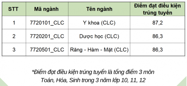 Với phương thức ưu tiên xét tuyển theo quy định của ĐHQG TP.HCM, điểm đạt điều kiện trúng tuyển với ngành Y khoa là 87,2 điểm, ngành Dược học và Răng-Hàm-Mặt cùng 86,3 điểm. Điểm đạt điều kiện trúng tuyển là tổng điểm 3 môn Toán, Hóa, Sinh trong 3 năm lớp 10,11 và 12. Thí sinh phải thỏa điều kiện đăng ký xét tuyển là thuộc danh sách 149 trường THPT theo quy định của ĐHQG TP. HCM, phải có học lực xếp loại Giỏi năm lớp 12.