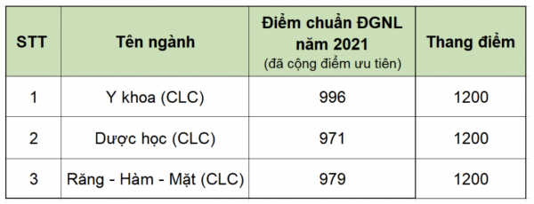 Theo đó, với phương thức xét kết kết quả kỳ thi ĐGNL, ngành Y khoa (chất lượng cao) với 996 điểm, ngành Dược học (Chất lượng cao) là 971 điểm và Răng - Hàm - Mặt (Chất lượng cao) là 979 điểm. Điểm xét tuyển là điểm thi ĐGNL năm 2021 của ĐHQG TP.HCM tổ chức cộng điểm ưu tiên đối tượng, khu vực (nếu có).