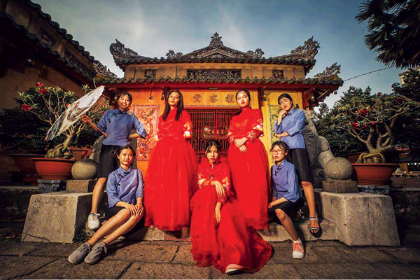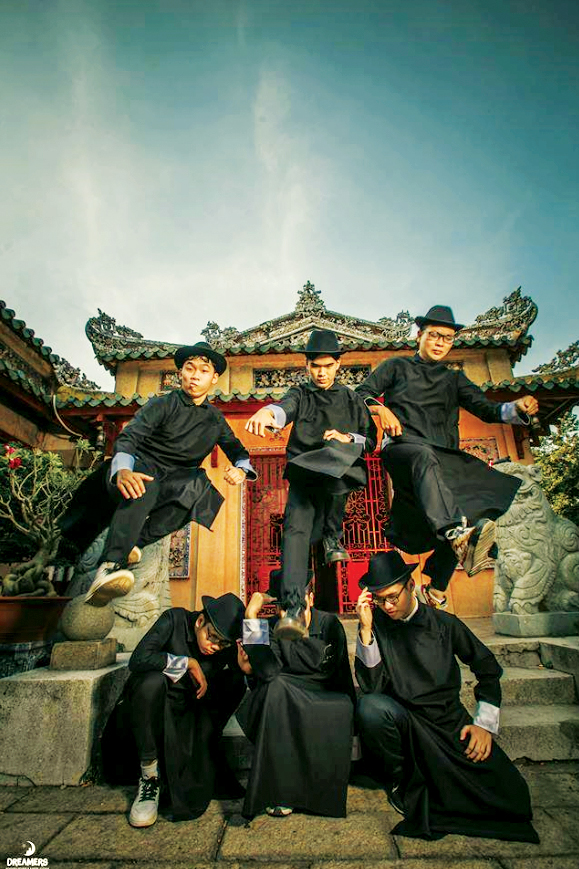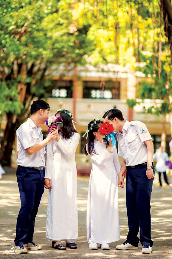 Bộ ảnh kỉ yếu lớp mình gồm hai phần, ảnh đồng phục trường lớp đúng chất thanh xuân và bộ ảnh phong cách cổ trang. Có một câu chuyện hậu trường khá hi hữu, khi lớp mình chụp ảnh trong Lăng Ông Bà Chiểu (Q.Bình Thanh), vô tình hôm ấy cũng có hai anh chị chụp ảnh cưới cổ trang. Lập tức cả lớp được anh chị “í ới” rủ làm phù dâu phù rể bất đắc dĩ, giúp anh chị có thêm những shoot hình lung linh, cực chất. Thế là từ chụp ảnh kỉ yếu, cả lớp trở thành chụp ảnh cưới.