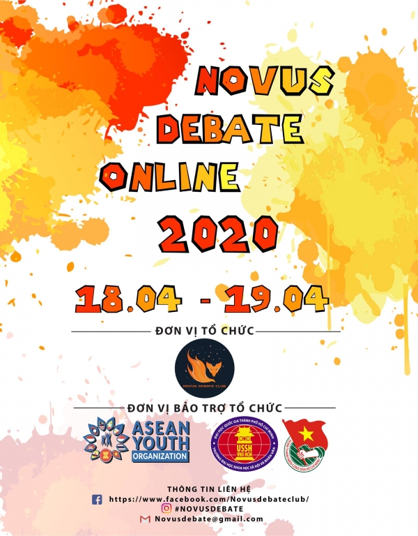NOVUS Debate Online 2020 là giải đấu tranh biện đầu tiên được tổ chức bởi CLB Tranh biện NOVUS, nhằm tạo nên sân chơi chất lượng cho các bạn trẻ được phát triển tư duy phản biện, tư duy hệ thống và trau dồi, bồi dưỡng kiến thức xã hội. Cuộc thi được sự bảo trợ của Đoàn trường Đại học Khoa học Xã hội và Nhân văn - Đại học Quốc gia Thành phố Hồ Chí Minh và tổ chức Asean Youth Organization.