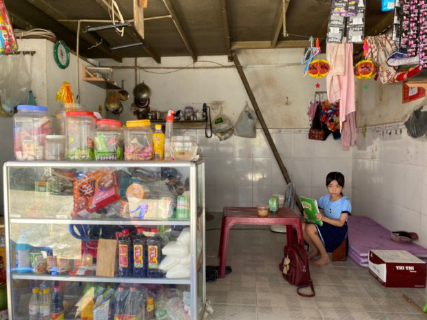 Vừa ngồi học bài vừa trông coi cửa hàng tạp hóa, em Đặng Thị Quỳnh (lớp 4/1, trường TH Lương Thế Vinh, huyện Bình Chánh) còn biết phụ giúp ba rất nhiều việc khác. Quỳnh cũng là một trong 8 em nhỏ được nhận quà và học bổng từ chương trình “Nhà của cầu vồng”.