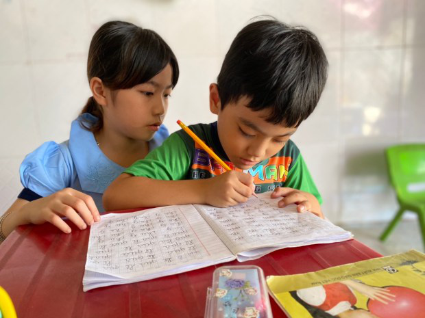 “Cô giáo” Quỳnh dạy em trai luyện chữ.