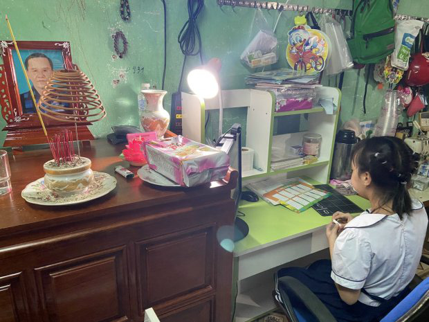 Ngồi học bài bên cạnh bàn thờ của ba, em Trần Nguyễn Bảo Ngọc (lớp 3/7, trường TH Quang Trung, quận 12) nhớ thương ba lắm! Dịch Covid-19 đem ba của em đi xa rồi, nhà trọ giờ chỉ còn mẹ và em! Bảo Ngọc cho biết trước dịch mẹ của em làm công nhân may tại công ty, nhưng giờ mẹ phải may tại nhà để hướng dẫn em học trực tuyến nên thu nhập rất hạn hẹp.