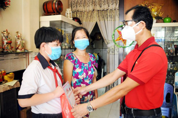 Đại diện báo Khăn Quàng Đỏ và Quận đoàn 8 trao học bổng cho Chung Ngọc Tiến