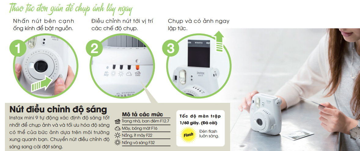 Trong dòng sản phẩm máy chụp ảnh lấy ngay thì instax mini 8 luôn tạo ra bước đột phá, sáng tạo, rất phù hợp vơi giới trẻ. Đồng thời tiếp thêm sự khéo léo cho các nhiếp ảnh gia trong nhiều công việc mang tính sáng tạo. Đó là lý do tại sao instax mini 9 chính là sự phản ánh của phiên bản Instax mini 8 nhưng được nâng cấp cho hiệu năng tốt hơn. Người sử dụng máy ảnh instax mini như là một máy ảnh nhỏ gọn, tiện ích, phong cách cho các bữa tiệc, lễ hội, sự kiện và là một vật không thể thiếu ở mọi lúc mọi nơi. Chúng tôi giúp cho khách hàng của mình chụp và lưu giữ lại những bức ảnh vui nhộn, ảnh kỷ niệm, chụp và có ảnh ngay tức thì. Instax mini 9 hiện có 5 màu sắc hợp thời trang gồm Hồng, Xanh lá, Xanh cô-ban, Trắng khói và Xanh biển thiết để phù hợp với sở thích của giới trẻ.