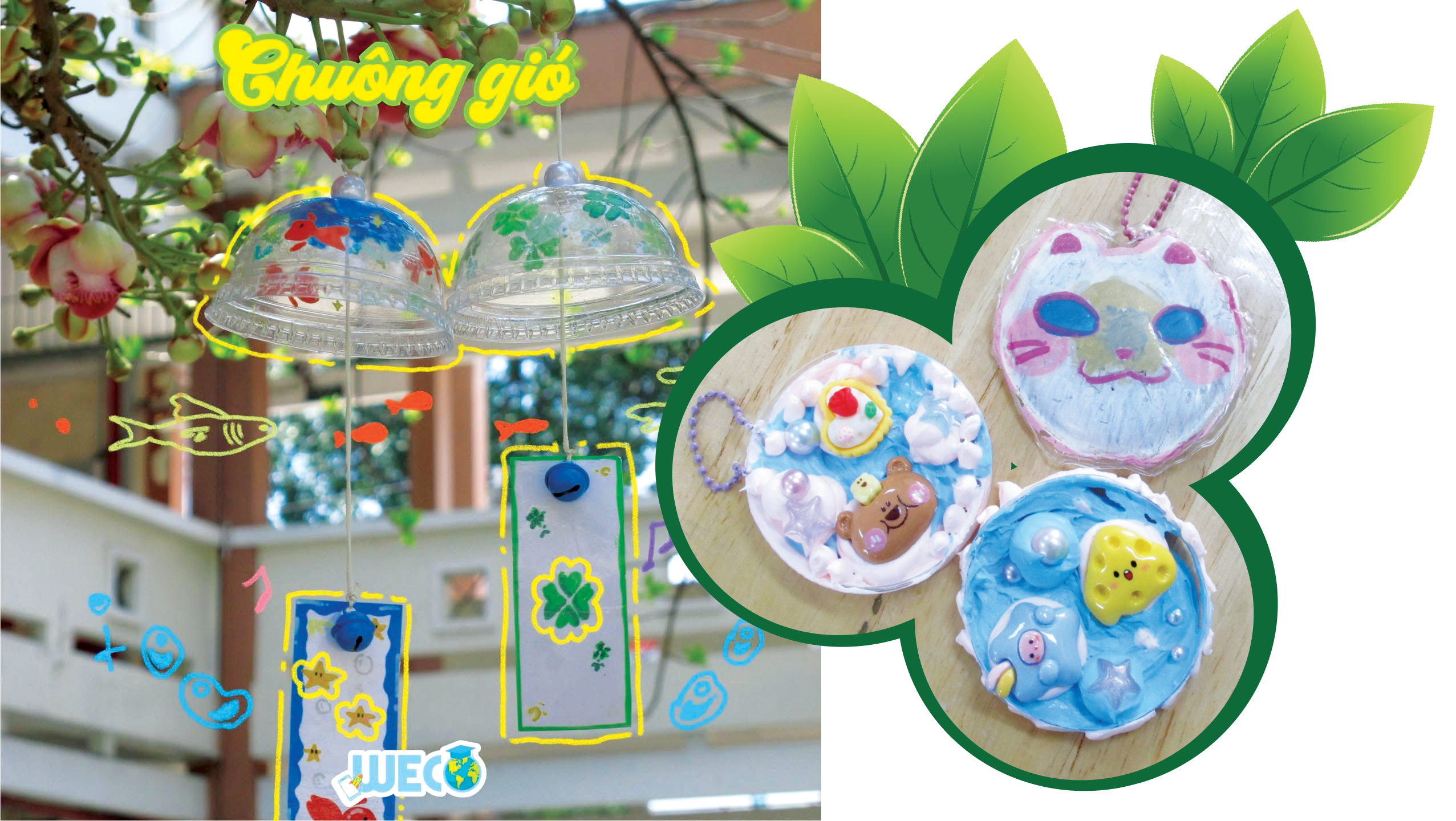 Cũng bắt đầu từ những việc nhỏ, trong các workshop của CLB WECO Environmental Activists, Dương Thụy Quân (Trường THPT Nguyễn Hữu Huân, phường Thủ Đức, TP.HCM) cùng team biến ly nhựa, bọc ni lông tưởng bỏ đi thành sản phẩm đầy sáng tạo. Móc khóa hình sứa từ ly nhựa, chuông gió bằng nắp trà sữa, giấy thủ công được tái chế... mỗi sản phẩm đều mang dấu ấn sáng tạo và thông điệp sống xanh.
