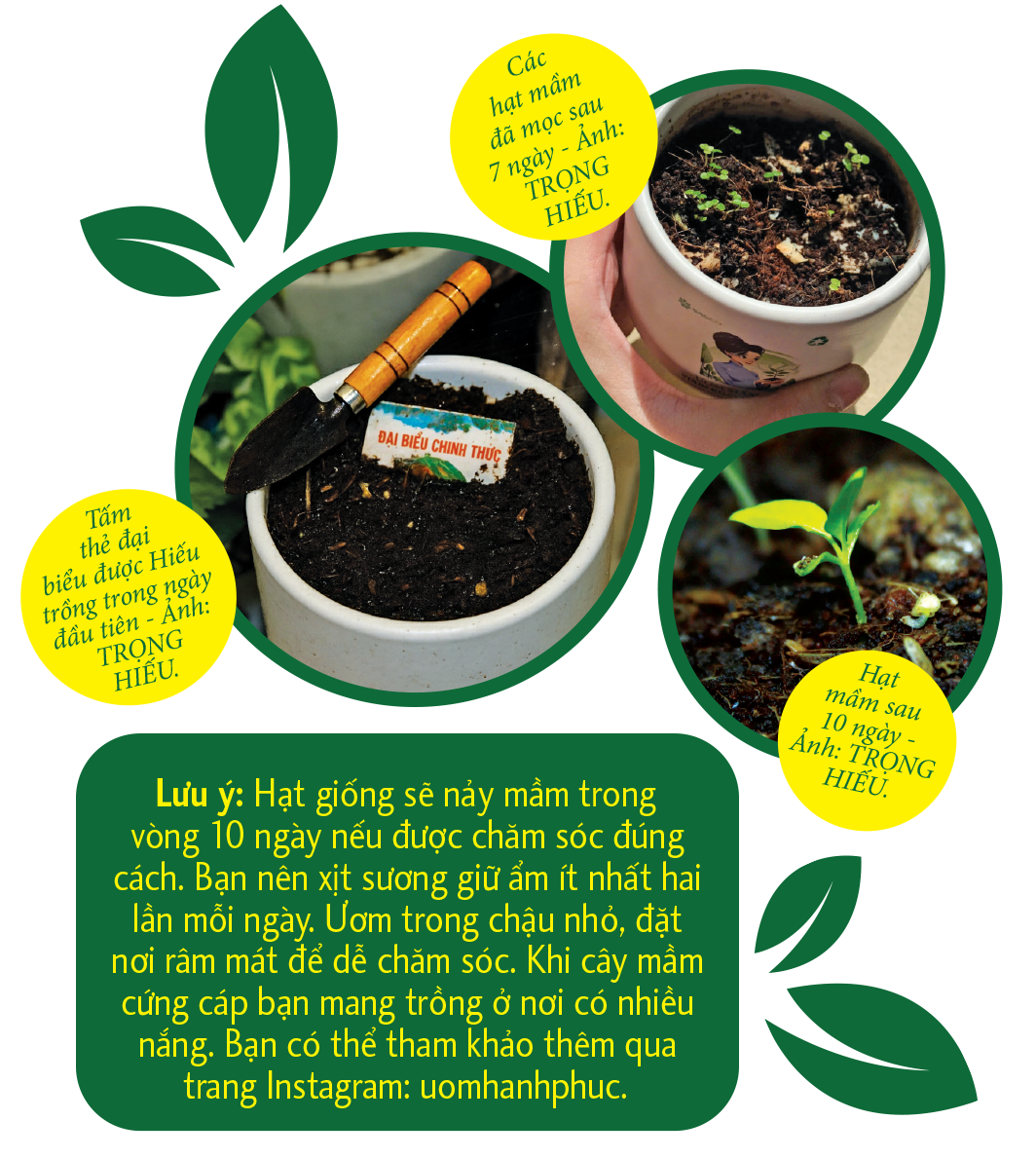Sau khi tham dự Đại hội Đoàn tại phường Đông Hưng Thuận, Hiếu không bỏ tấm thẻ đại biểu mà làm theo hướng dẫn của ban tổ chức: vùi thẻ vào chậu đất, tưới nước giữ ẩm, chờ vài ngày sẽ nhận được điều bất ngờ. “Sau bảy ngày, từ tấm thẻ đã mọc lên rất nhiều mầm xanh. Trải nghiệm này giống như cô Tấm, chôn xương cá rồi chờ ngày có quần áo đẹp. Còn mình chôn tấm thẻ và nhận về những mầm cây”, Hiếu hài hước.