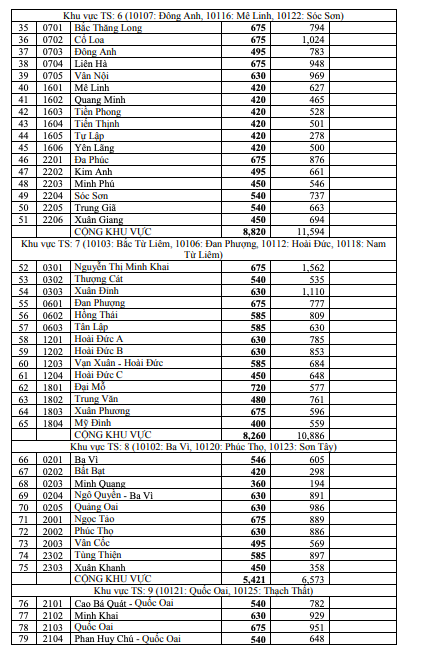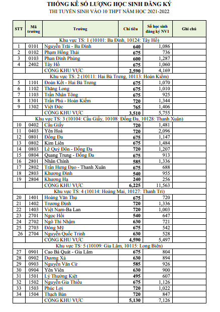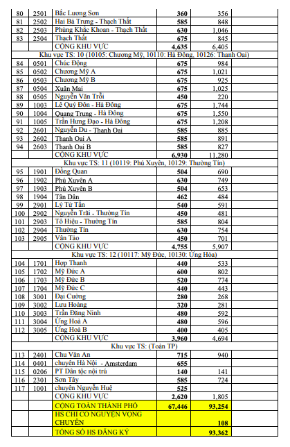 Năm nay, toàn thành phố Hà Nội có 93.362 học sinh đăng ký dự tuyển, số học sinh đăng ký nguyện vọng 1 là 93.254 em, còn lại 108 học sinh chỉ đăng ký dự tuyển vào các lớp chuyên. Tổng chỉ tiêu tuyển sinh vào lớp 10 của các trường là 67.446 học sinh.