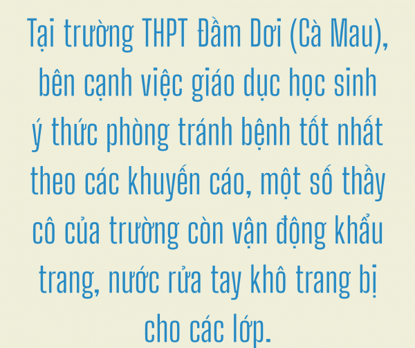 Ghi nhận tại trường THPT Phú Hưng (Cái Nước), phòng học cũng được bố trí đảm bảo khoảng cách 2 mét, sĩ số lớp được chia nhỏ. Đồng thời căn tin trường cũng tạm ngưng đóng cửa, giờ giải lao các bạn học sinh không được tập trung đông. Trường chuẩn bị sẵn xà phòng rửa tay, bố trí các bồn rửa tay, phun thuốc diệt khuẩn trước khi đón học sinh trở lại trường học.