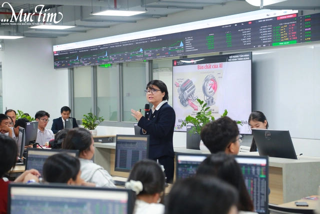 TS. Trẩm Bích Lộc (Trưởng Bộ môn Công nghệ tài chính của Trường đại học Văn Lang) giảng dạy tại một lớp học thử - Ảnh: HOÀNG VY