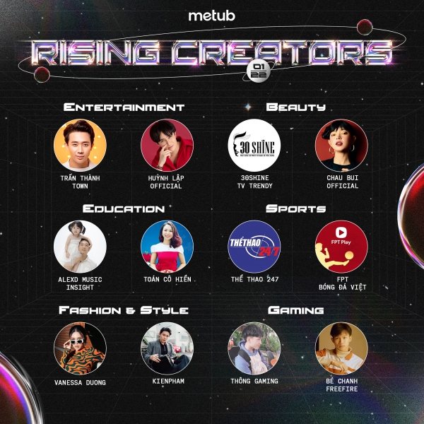Mới đây, METUB Network đã chính thức công bố bảng xếp hạng “Creators in the spotlight" tháng 1/2022 với nhiều cái tên quen thuộc như Trấn Thành Town (tăng 696.78%), Huỳnh Lập Official (tăng 291.14%), 30 Shine TV Trendy (tăng 43.87%), Châu Bùi Official (tăng 107.35%), Alexd Music Insight (tăng 719.10%), Toán Cô Hiền (tăng 122.71%), Thể Thao 24/7 (tăng 275.08%), FPT Bóng Đá Việt ( tăng 428.59%), Vanessa Duong (tăng 127.35%), KIENPHAM (tăng 108.09%), Thông Gaming (tăng 255.18%), Bé Chanh Freefire (tăng 196.47%).