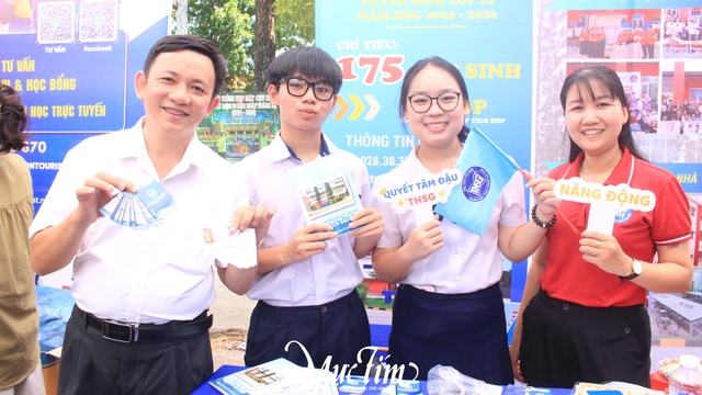 Thầy Hồ Lộc Thuận (phó hiệu trưởng) và cô Nguyễn Thị Thanh Trúc (trợ lý thanh niên) cùng học sinh Trường Trung học Thực hành Sài Gòn (quận 5) tại gian tư vấn ở Ngày hội Tự tin vào lớp 10 năm 2025 - Ảnh: THẢO NGỌC