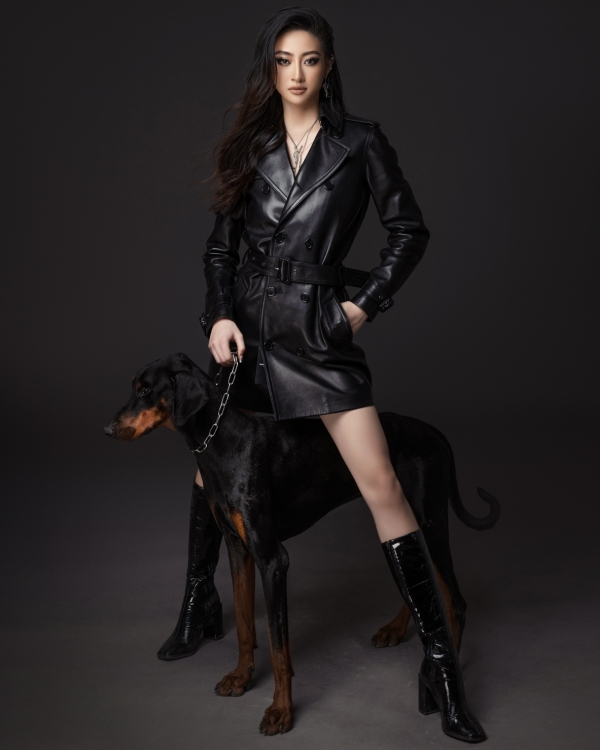 Ở một layout khác, nàng Hậu xuất hiện với cách phối đồ “all- black”. Với phong cách “đen toàn tập” này, Lương Thuỳ Linh trông thật ngầu và bí ẩn vô cùng. Diện mốt “giấu quần” cùng áo khoác da và boots cao cổ, phong cách này là lựa chọn tối ưu dành cho những quý cô hiện đại muốn thể hiện tinh thần “girl boss”.