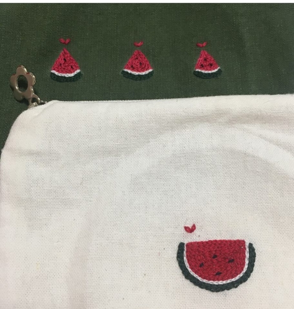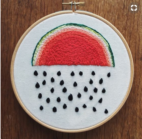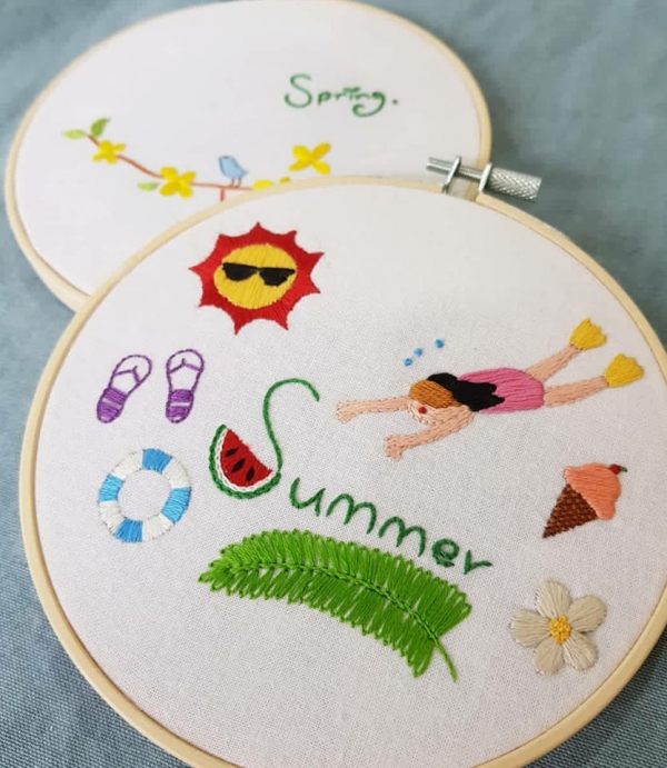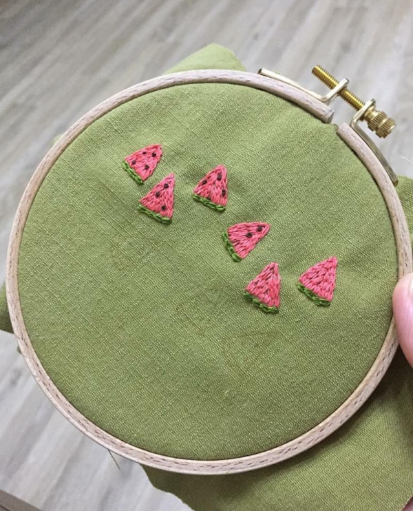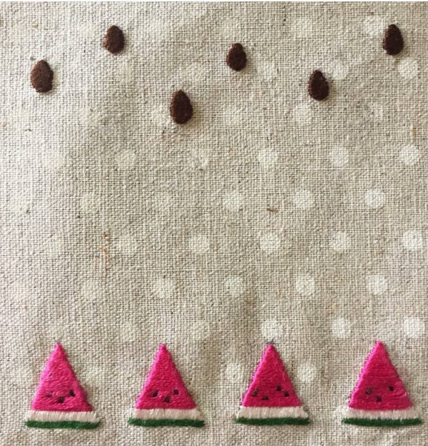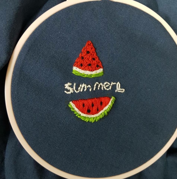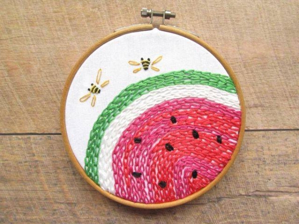 Vào hè, những họa tiết được ưa chuộng như: lá cọ, trái thơm, dưa hấu... được xuất hiện thường xuyên trên khung vải. Bạn có thể bắt đầu từ những mũi thêu cơ bản như mũi móc xích, thêu bạt, mũi sa hạt... Những chi tiết sẽ trở nên sống động hơn khi bạn biết cách kết hợp loại vải và mũi thêu.