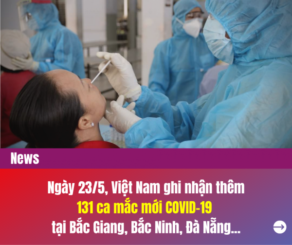 Tính riêng từ 12h đến 18h ngày 23/5, Việt Nam có 76 ca mắc mới tại Bắc Giang (57) và Bắc Ninh (19). Cụ thể, ca bệnh BN5142-BN5160 ghi nhận tại tỉnh Bắc Ninh, 18 ca là F1, 1 ca sàng lọc ho sốt. Kết quả xét nghiệm ngày 21-23/5/2021 dương tính với SARS-CoV-2.