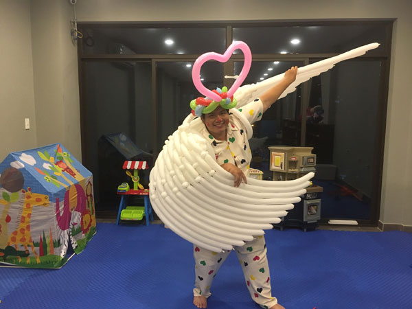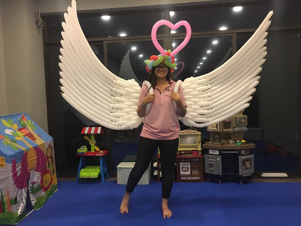 “Thời gian rãnh, mình sẽ lên mạng xem, học hỏi cách thức cũng như kĩ thuật của các nghệ nhân nước bạn để hoàn thiện bản thân hơn” anh Hiếu cho biết thêm. Một trong những tác phẩm mà nghệ nhân Ngọc Hiếu tâm đắc nhất, đó là đôi cánh thiên thần “siêu khủng” có chiều dài khoảng 2 mét, đính kèm là chiếc nón thiên thần “siêu” đáng yêu, làm hoàn toàn chỉ bằng bong bóng. Anh bỏ ra 2 giờ đồng hồ để thực hiện nó, bơm bong bóng, vặn rồi ghép chúng lại với nhau thành hình thù đôi cánh. Với đôi cánh này, các bạn có thể vô tư tạo đủ dáng để có những bức ảnh xuất sắc mà không cần lo lắng nó sẽ bị vỡ nhé!