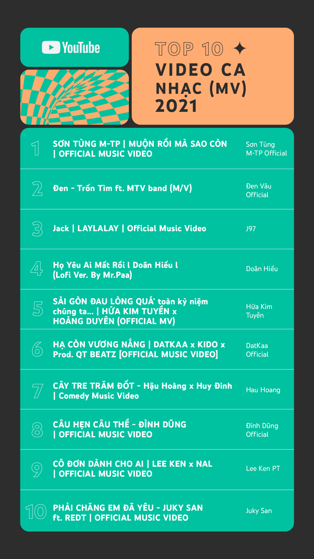 Cụ thể, tại bảng xếp hạng những MV nổi bật năm 2021, những cái tên quen thuộc như: Sơn Tùng, Jack, Đen Vâu giữ thứ hạng cao bằng những ca khúc triệu view được giới trẻ yêu thích.