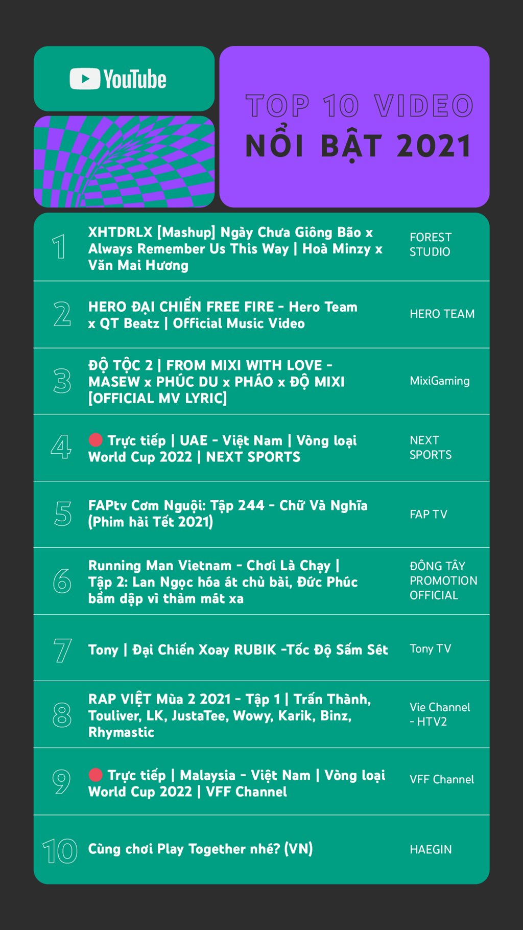 Nền tảng chia sẻ video Youtube đã công bố các bảng xếp hạng những video được xem nhiều nhất trong năm 2021 tại thị trường Việt Nam, dữ liệu được thống kê từ ngày 01/01/2020 đến ngày 30/12/2020 của hơn 7 triệu lượt người dùng tại thị trường Việt Nam.