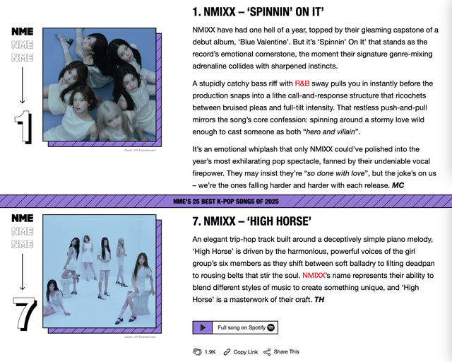 Theo danh sách do NME (Anh) chọn ra, nhóm nữ NMIXX đã đạt vị trí No.1 với Spinnin' on it (ca khúc chủ đề từ full album đầu tay Blue valentine) và vị trí No.7 với High horse (thuộc mini album thứ 4 Fe3O4: Forward).