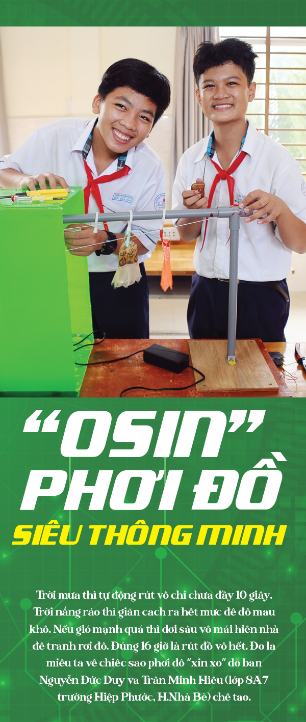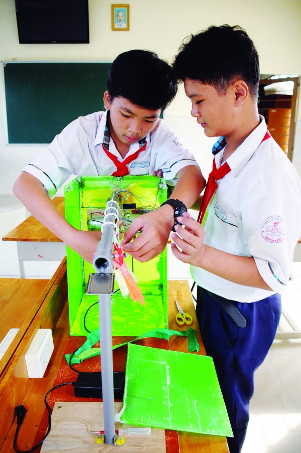 Bạn Đức Duy phác thảo: “Phơi đồ phải dùng đến mô-tơ giảm tốc nhưng tìm sơ đồ cấu trúc ở đâu?”. Cứ sau giờ học là 2 bạn lại lên Internet mày mò về sơ đồ máy móc, cánh tay ròng rọc, móc treo cố định… Từng bước nghiên cứu, tìm tòi theo đúng trình tự STEM rồi làm thử nghiệm, chỉnh sửa. Bạn Minh Hiếu nhớ lại: “Trên mạng cũng có những mô hình gần giống nhưng trang thiết bị không có ở Việt Nam hay nếu có thì rất mắc”. Thế là cả hai tranh thủ ngày cuối tuần đạp xe xuống chợ điện tử Nhật Tảo tại Quận 10 tìm kiếm thiết bị. Những gian hàng đồ cũ, máy móc giá mềm đều được các bạn ghé qua để chọn những vật tư cần thiết. Đức Duy cười lớn: “Có những lúc chưa kịp làm chân đế, tay giữ cho bộ ròng rọc cuốn trượt, tụi mình thay nhau dùng tay cầm đến độ mỏi mệt luôn để thử nghiệm”. Chính những lúc này, các bạn mới phát hiện thêm bước để hoàn chỉnh hơn cho mô hình của mình. Dây ròng rọc phải chắc mới chịu nổi trọng lượng của móc treo đồ, mô-tơ giảm tốc phải đủ mạnh để cuốn dây treo đồ, nguồn điện phải từ 5 ampe trở lên mới vận hành toàn hệ thống… Cứ thế, sào phơi đồ cảm biến theo thời tiết đã dần dần hoàn thiện. Các bạn cho biết: “Cái khó nhất chính là phần kết nối điều khiển các cảm biến mưa, gió, ánh sáng vào bộ xử lí trung tâm của mô-tơ điều khiển. Quy trình này tốn rất nhiều công sức cũng như thời gian của đôi bạn”. Sau gần 1 tháng vừa học vừa làm vừa thí nghiệm, công trình cũng đã hoàn thành trong niềm mong chờ của cả lớp.