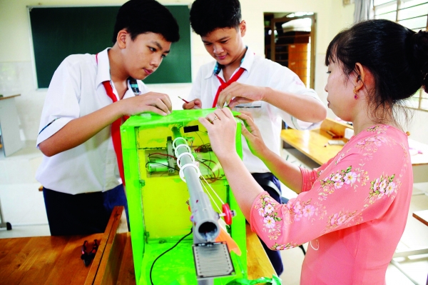 Cô trò cùng kiểm tra công đoạn lắp ráp sau cùng.