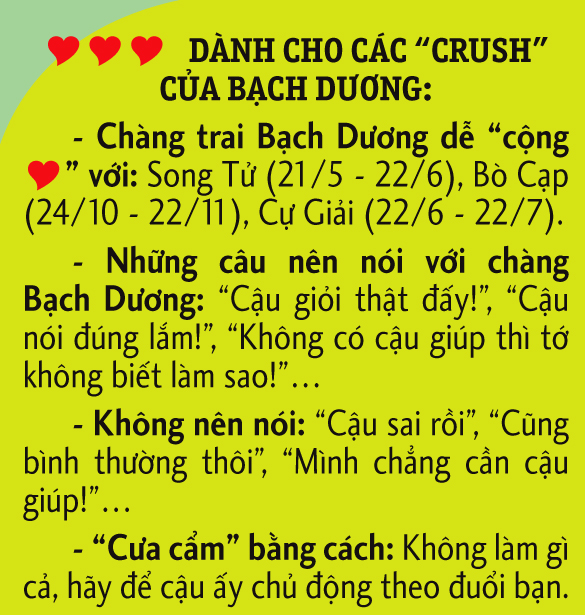 Khi đã thật sự thích một cô gái, cậu ấy sẽ không ngần ngại chuyện cô ấy có cảm tình với mình không, mà sẵn sàng lên kế hoạch chứng tỏ sự mạnh mẽ với bạn, rất tự tin là bạn sẽ “đổ”. Hãy tạo cơ hội cho Bạch Dương giúp đỡ và chứng minh sự nam tính của bạn ấy. Tuy nhiên, Bạch Dương thích là thích, không thích là không thích, nếu như cậu ấy không để tâm đến bạn, thì có nghĩa là bạn chẳng có cơ hội nào đâu! Tự bày tỏ trước hay cố chinh phục cậu ấy, bạn sẽ rước vào mình sự lạnh lùng và tổn thương thôi.