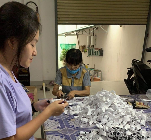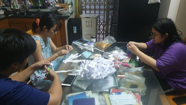 Với những nguyên vật liệu đơn giản như dây chun, cúc áo loại to cùng với kim, chỉ, nến đốt, bắt đầu từ giữa tháng 7 đến nay, Đăng Tâm đã cùng người nhà của mình tỉ mỉ làm gần 10.000 chiếc chiếc “tai giả” để gửi cho lực lượng nhân viên y tế.