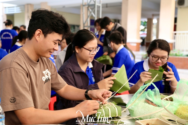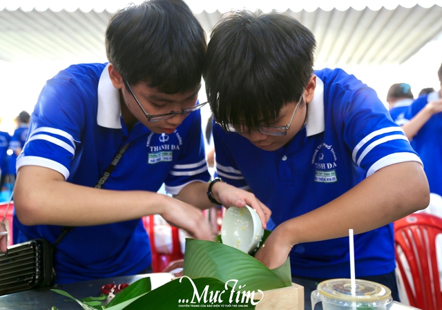 Cuộc thi gói bánh chưng được tổ chức từ buổi sáng với sự tham gia của các lớp khối 11. Mỗi lớp cử 10 học sinh dự thi và các bạn cần hoàn thành 4 chiếc bánh chưng sao cho thật đẹp, xanh mướt bên ngoài nhưng vẫn giữ được sự dẻo thơm, đậm đà của nếp và thịt bên trong.