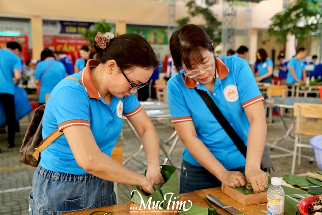 Trong không khí sôi nổi của ngày hội, nhiều thầy cô cũng trực tiếp tham gia hỗ trợ và hướng dẫn học sinh ở các công đoạn gói bánh.