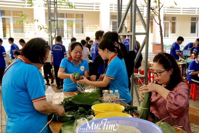 Bên cạnh những nhóm dự thi của các em học sinh, nhiều thầy cô khác của trường cũng cùng nhau gói những chiếc bánh chưng, bánh tét.