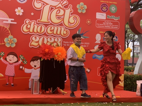 Ngoài địa điểm chính tổ chức tại SC VivoCity (Q.7), trong sáng 8/1, chương trình Tết cho em cũng đã đến thăm, tặng quà tại chùa Long Hoa và Làng Hòa Bình.