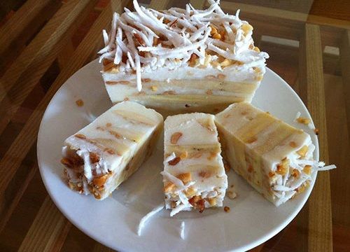 B1: Cho bột năng, nước lọc, nước cốt dừa, đường và một ít muối vào trong nồi và bắc lên bếp. Sau đó khuấy đều đến khi hỗn hợp trên sôi và sánh lại thì tắt bếp