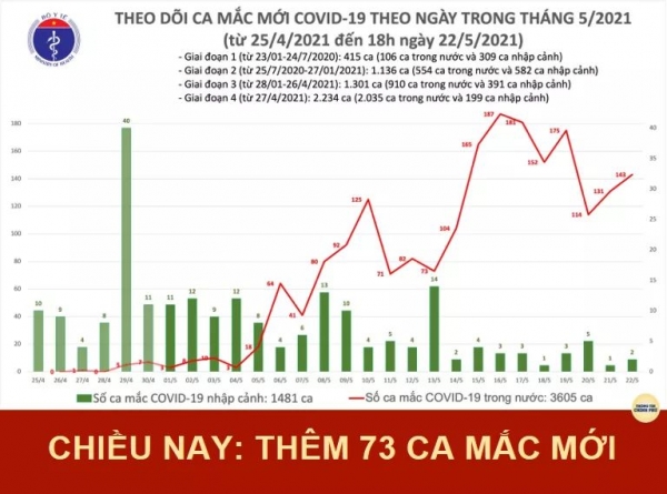 Tính đến 18h ngày 22/5, Việt Nam có tổng cộng 3.605 ca ghi nhận trong nước và 1.481 ca nhập cảnh. Số lượng ca mắc mới tính từ ngày 27/4 đến nay: 2.035 ca.