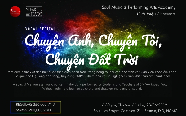 Thì lúc đó, bạn sẽ dễ dàng tập trung vào vẻ đẹp của thanh âm và vẽ ra những bức họa tinh tế nhất, từ tưởng tượng rất riêng của mỗi người. Đó là thông điệp của chương trình Âm nhạc trong bóng tối - Music in the dark – lần 3, mang tên Chuyện anh, chuyện tôi, chuyện đất trời sẽ diễn ra lúc 18h30, ngày 28/06/2019, tạiSoul Live Project (214 Pasteur, Q.3).