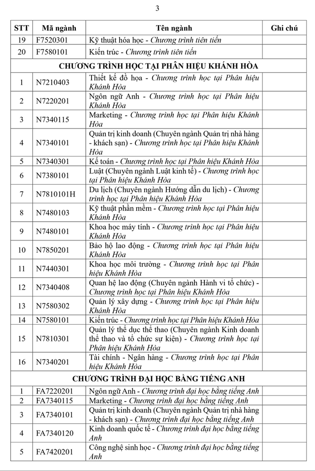 Trong đó, Trường đại học Tôn Đức Thắng mở 20 ngành chương trình tiên tiến, 11 ngành chương trình đại học bằng tiếng Anh, 10 ngành chương trình dự bị đại học bằng tiếng Anh, 16 ngành chương trình học tại Phân hiệu Khánh Hòa, 15 ngành chương trình liên kết đào tạo quốc tế, 14 ngành chương trình dự bị liên kết đào tạo quốc tế.